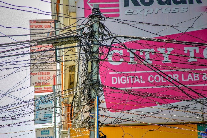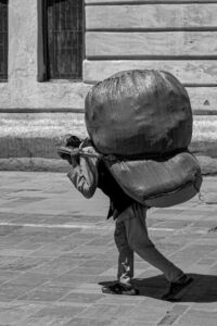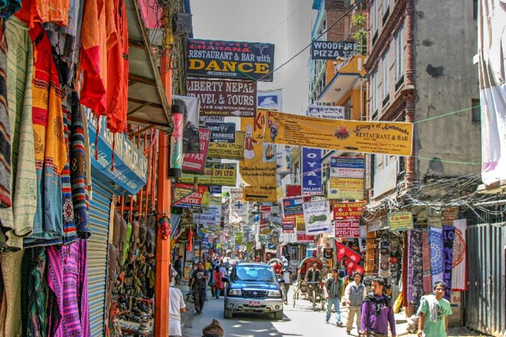 Voltando à cidade, ela é completamente caótica, mas de uma beleza singular. Velhos automóveis e motorizadas apitam frenética e desalmadamente em todas as ruas. Os ciclistas carregam na orelha das campainhas de velhas “pasteleiras”, fazendo o barulho possível. Nenhum veículo se detém em passadeiras ou semáforos. Andarem fora de mão também é algo absolutamente normal. As ruas são atravessadas por quilómetros e quilómetros de cabos, pendurados nos locais mais estranhos e sem algum tipo de lógica ou plano. Finalmente chegámos ao bairro Thamel, mesmo no coração da cidade, e talvez um dos bairros mais movimentados. Aqui amontoam-se placas e mais placas publicitárias de albergues, hotéis, cafés, restaurantes, agências de “trekking”, lojas de equipamento de caminhada, entre muitas outras coisas. Para além de todo o movimento de centenas ou mesmo milhares de lojas e clientes, abundam nas ruas vendedores de legumes e de especiarias e de transportadores de mercadorias, muitas vezes às costas, apenas com um apoio da carga na sua testa. Caótico, mas muito interessante de se observar, e conseguimos ver, como o caos também tem organização. Parte superior do formulário