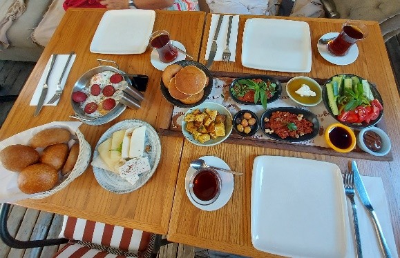 Outra opção, imperdível em Istanbul, é o chamado pequeno-almoço turco, mais brunch que pequeno-almoço, dada a variedade e quantidade de comida que nos é servida. O festim inclui vários tipos de queijos, azeitonas de diversas qualidades, tomate e pepino fresco, pão turco ou pão sírio, ovos, salsicha de carne de vaca, mel, manteiga, compotas, pasta de tahine, sempre acompanhado pelo chá turco. É tudo servido em pratinhos pequenos, ao estilo meze, para poder ser partilhado por todos os que estão na mesa. Nós fomos ao Van Kahvalti Evi, que serve até às 11H00. Está sempre cheio e dizem que é o mais autêntico da cidade. Fica perto da Praça Taksim.