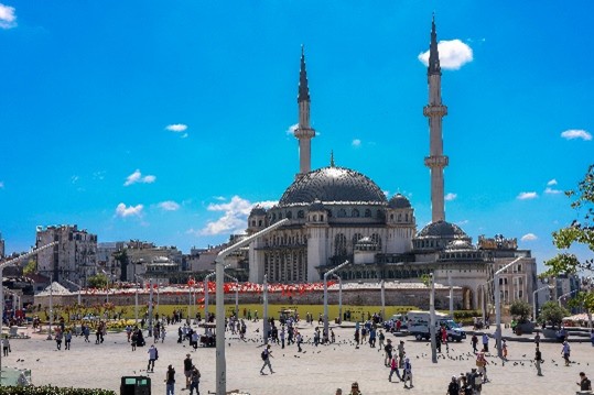 A Praça Taksim será a mais central e emblemática da cidade e onde tem início a principal rua de Istanbul, a Rua Istiklal. Todos os festejos, protestos, festas nacionais e encontros públicos acontecem nesta praça. Aqui pode-se visitar o Monumento da República, que celebra a fundação da mesma, e a Mesquita Taksim. A Praça acaba por ser também a divisão entre a parte histórica e a parte moderna.Parte superior do formulário.