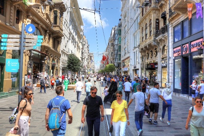 A Rua Istiklal é das mais famosas e movimentadas. Tem 1,5 km de comprimento, é pedonal, circulando apenas o histórico elétrico vermelho. Tem várias lojas de marcas internacionais, boutiques locais e muita oferta de restaurantes, cafés históricos e confeitarias tradicionais. Nas estreitas ruas laterais, bares de diversos estilos, têm uma oferta diversificada, assim como pequenos alfarrabistas e pequenas galerias de arte. Como curiosidade, esta rua, durante o Império Otomano, tinha o nome de Grande Rue de Péra, alterando o nome após a constituição da República, para Istiklal, que significa Independência. É aqui que também se pode visitar a Igreja de Santo António de Pádua, a maior igreja católica romana da cidade. Tendo já sido palco de atentados, a rua é fortemente patrulhada por forças policiais.