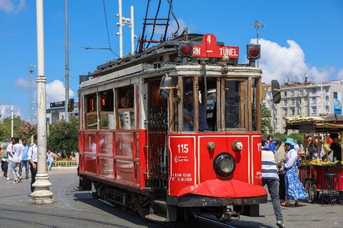 O elétrico vermelho que percorre a rua em toda a sua extensão, custa 27 TL por viagem, e é apenas para matar saudades da nostalgia deste transporte. Normalmente anda sempre apinhado de turistas, pelo que se torna mais interessante fazer a rua a pé. Aliás, esta é seguramente a melhor forma de conhecer a cidade. Sempre que a visitamos, a nossa média diária fica sempre entre os 15 e os 18 km.