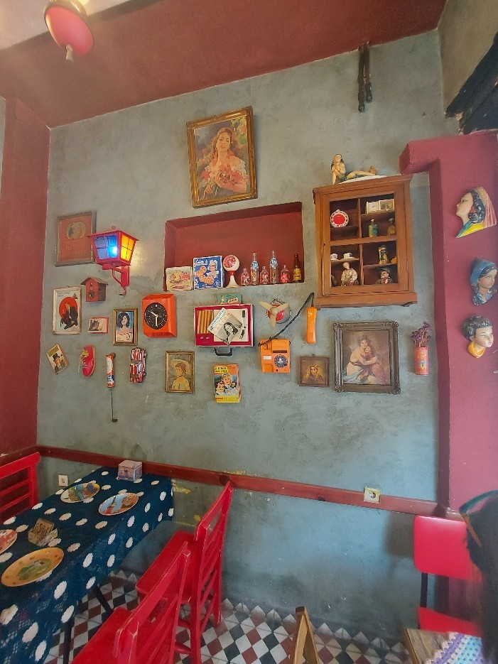 Afinal, o que torna o Naftaline um local especial? Tem uma decoração retro e vintage, absolutamente fantástica, o que lhe dá uma estética nostálgica encantadora. Tem objetos kitsch, que lhe dão uma alma gigante. E depois tem os gatos, parte da família do café. Todos eles resgatados, que fazem parte integrante de este conjunto absurdo e encantador simultaneamente. Os gatos circulam livremente por todo o espaço, e não são raras as vezes que tomamos o pequeno-almoço ou bebemos um chá, com um gato refastelado em cima da mesa, num sono profundo, apenas interrompido por uma festa, mas que rapidamente é retomado. A não perder as deliciosas bolachas caseiras em forma de cara de gato. A melhor mesa, como todas, com uns longos napperons em croché, do tempo das nossas avós, fica ao pé da janela grande da montra. Sentem-se, relaxem, peçam um chá e bolachas, curtam os gatos e observem o movimento da rua. Vão ficar viciados neste local. Levantando já um pouco o véu sobre o nosso regresso à cidade, certamente no próximo ano, num projeto de exploração exclusiva da parte asiática, viremos à parte europeia de propósito ao Naftaline. Fica ainda uma questão para vos esclarecer, mas que deixarei para vossa descoberta. Vão ao WC no Naftaline. Não vou dizer qual é a porta. No final da crónica uma seleção de fotos do Naftaline, porque as imagens neste caso falam melhor.