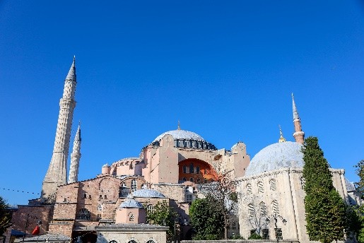 Um pouco mais acima encontram Hagia Sophia, um monumento emblemático da cidade, e o que mais transformações sofreu. Foi construída pelo Imperador Justiniano no ano de 537, tendo sido, durante 900 anos, a maior igreja cristã ortodoxa. Em 1453, após a conquista da cidade de Constantinopla, foi convertida em mesquita. Após a fundação da República passou a museu, sendo que em 2020 passou de novo a ser mesquita, e atualmente passou de novo a ser museu. Nós visitámos enquanto mesquita, pelo que a entrada foi gratuita, mas hoje a entrada custa 25 €. Tem uma imponente cúpula central, medalhões de caligrafia gigantes, e ainda se podem ver símbolos cristãos, com ícones de Jesus e da Virgem Maria. Património Mundial da UNESCO.