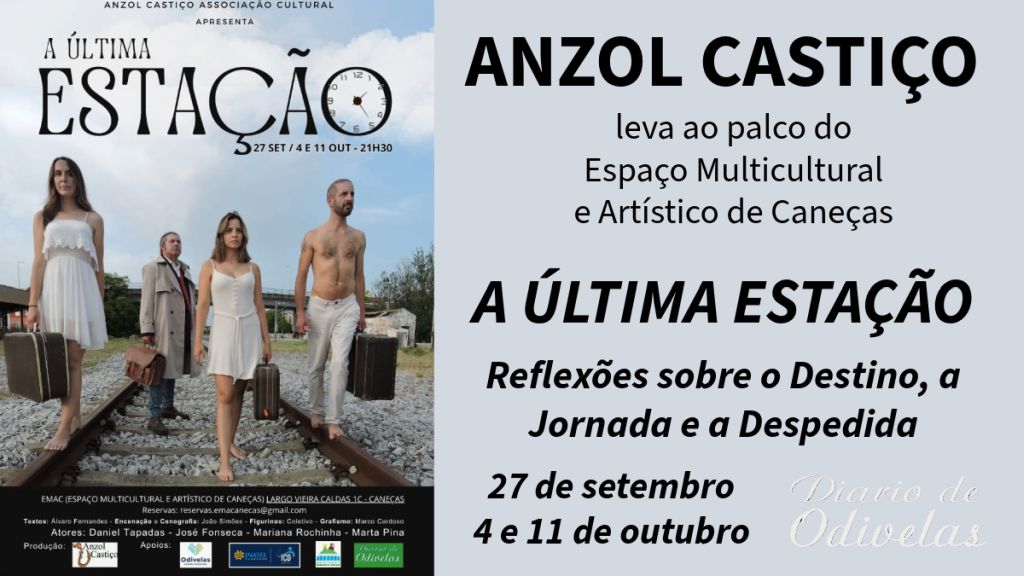 Nos dias 27 de setembro, 4 e 11 de outubro a Associação Cultural Anzol Castiço leva ao palco do Espaço Multicultural e Artístico de Caneças a peça “A Última Estação”, do dramaturgo brasileiro Álvaro Fernandes, com encenação e dramaturgia de João Simões; Figurinos a cargo do Coletivo Anzol Castiço; Grafismo de Marco Cardoso. Em cima do palco estarão Daniel Tapadas, José Fonseca, Mariana Rochinha e Marta Pina. Reserve já o seu lugar: reservas.emacanecas@gmail.com