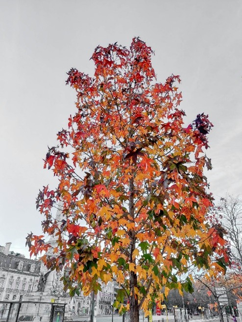 O final de tarde reflete-se nas árvores ainda com “roupa” e nas fachadas dos prédios coloridos.