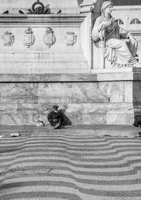 No seu sopé, uma senhora que infelizmente já nem saberá o que é o Natal, tenta ganhar mais um dia. É apenas mais um dia para sobreviver…