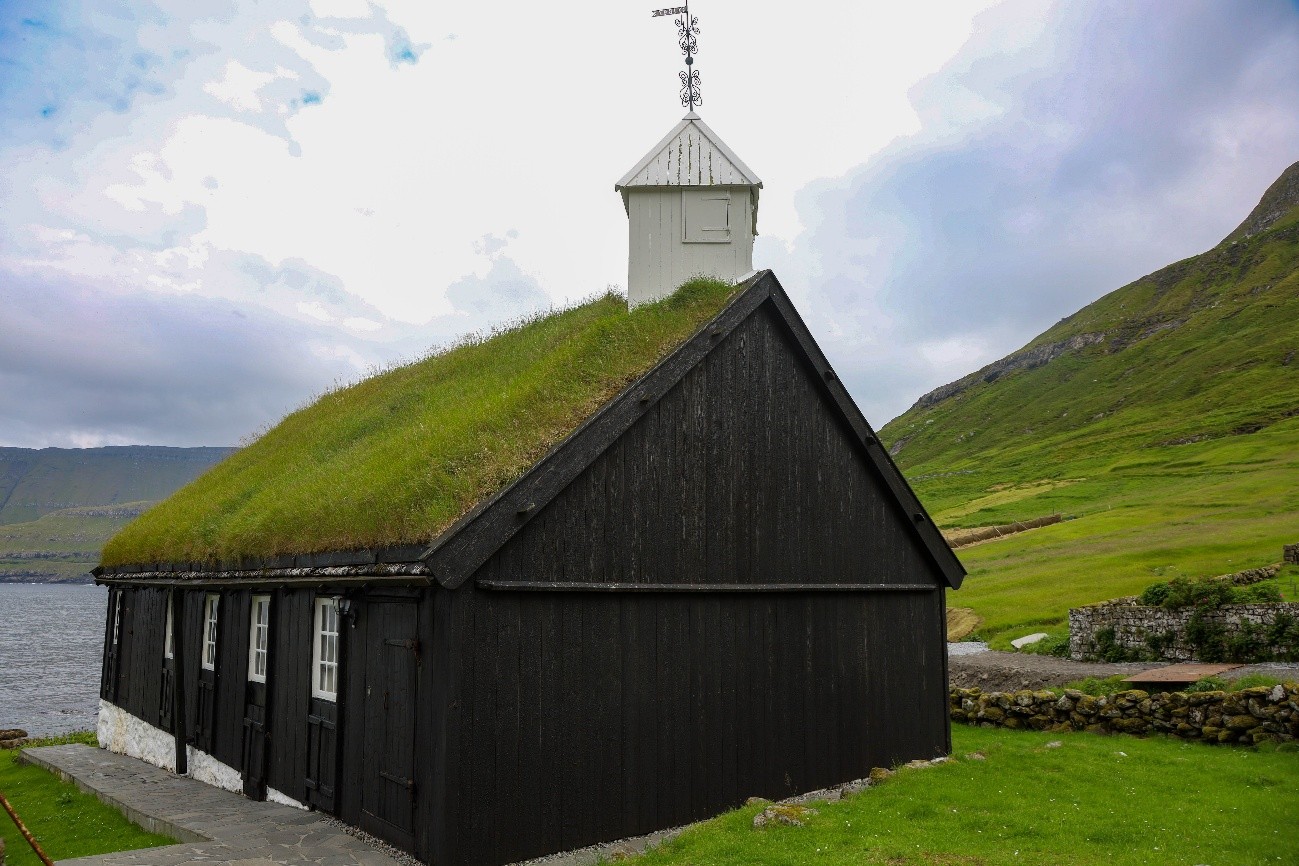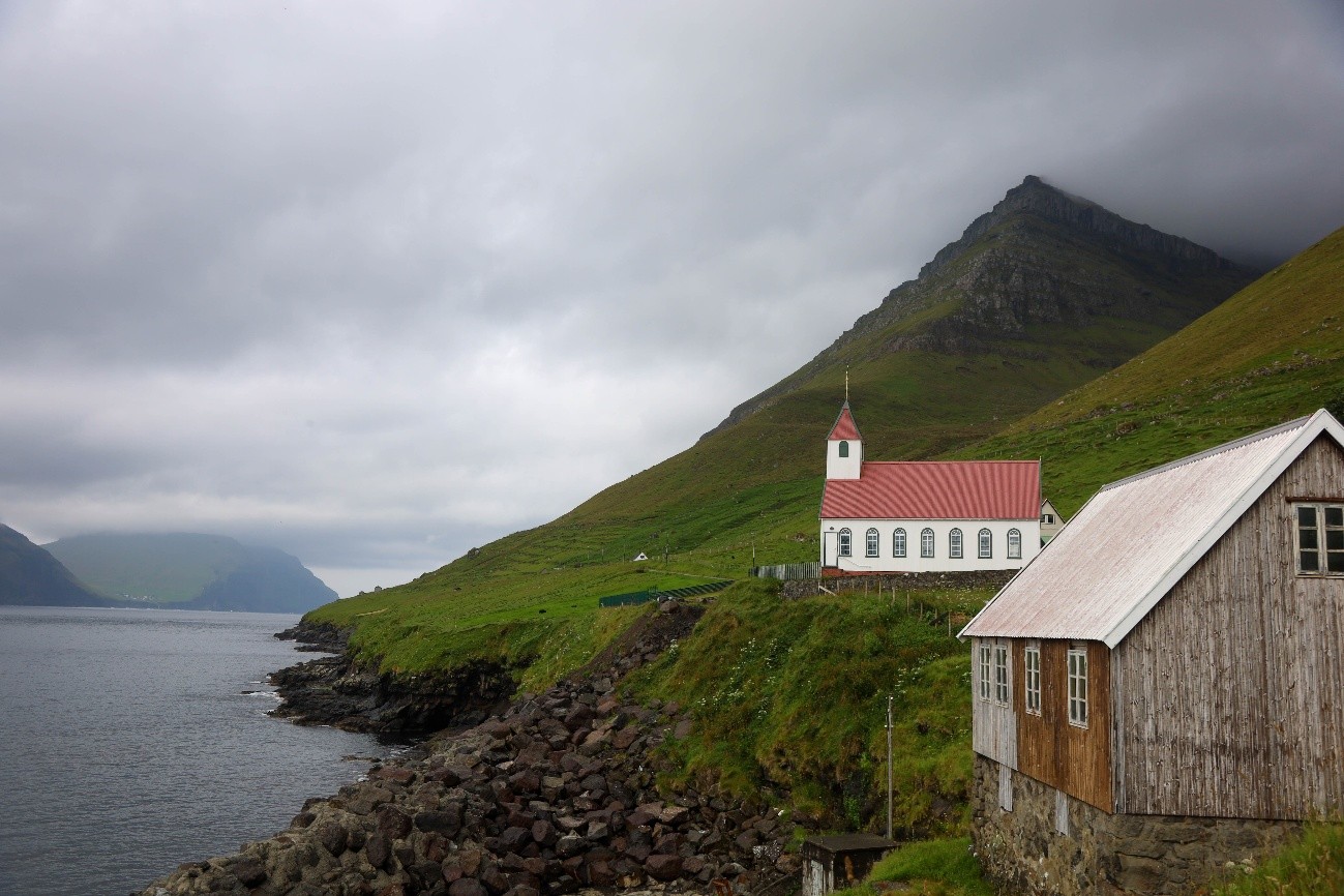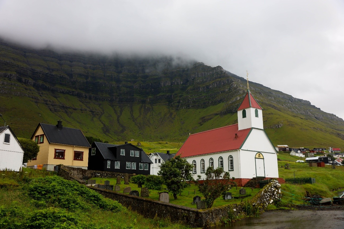 Finalmente chegámos à Ilha de Vidoy, através da ponte Hvannasund, que liga duas ilhas. Fomos visitar a vila de Vidareidi, o ponto mais setentrional da ilha, com vistas para o mar aberto do Atlântico Norte. A Igreja destaca-se na paisagem, e dá um excelente ponto fotográfico. As casas coloridas e tradicionais, pintalgam a paisagem, criando um charme único.