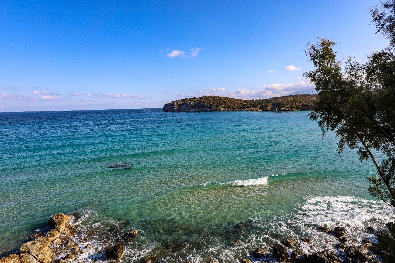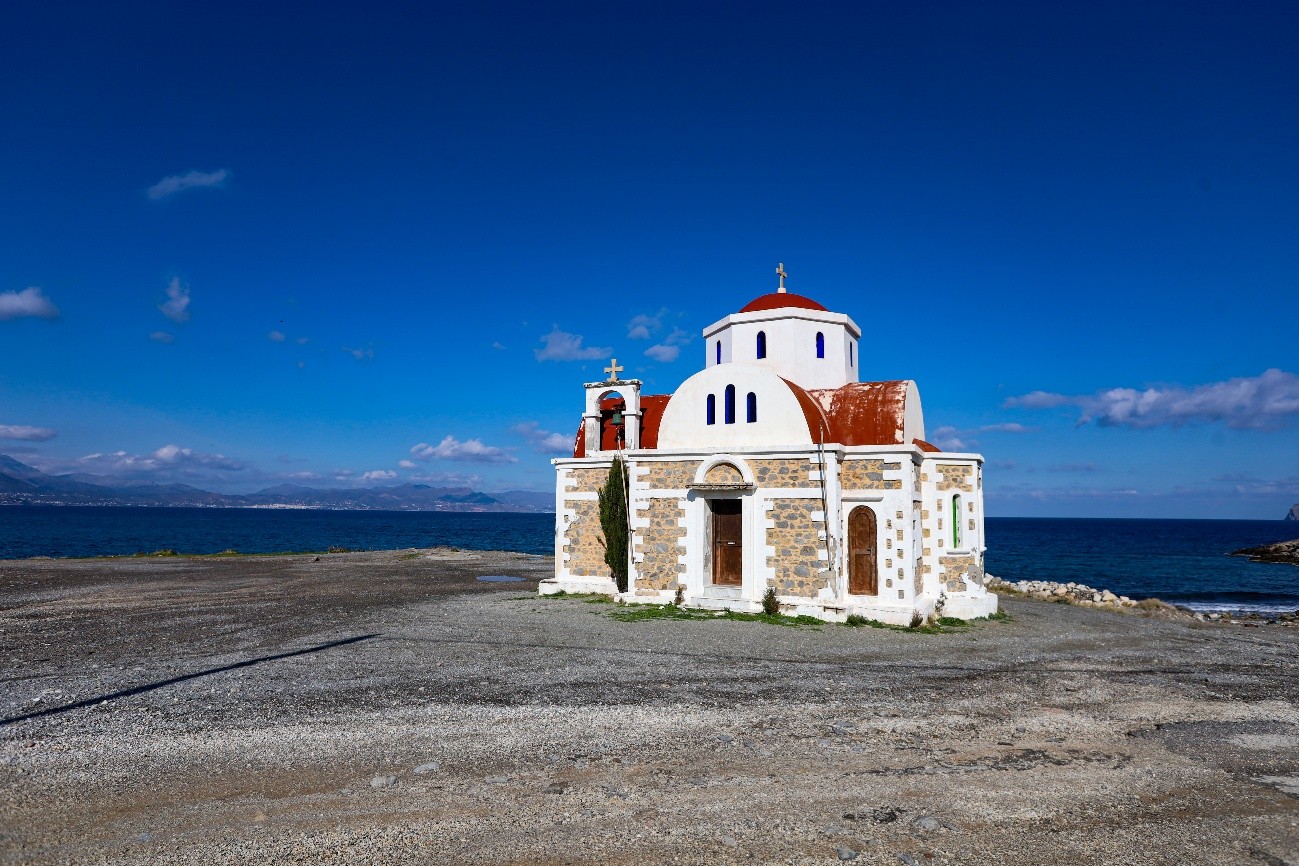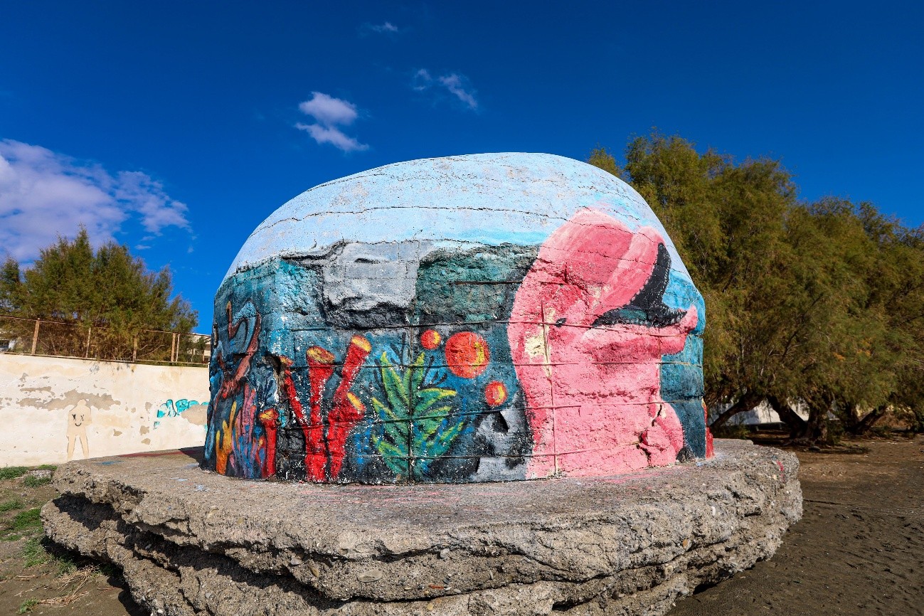 De novo na costa norte, para apanhar a estrada que segue para a costa sul. Muito perto do cruzamento, tempo ainda de visitar a igreja Agia Fotini, com uma vista linda para o mar. E seguimos diretos para Lerapetra, na parte sul da ilha de Creta. Passagem pelo LIDL, aqui muito comum, para comprar almoço e snacks para os gatos, com quem nos vamos cruzando. Têm sido muitos e praticamente todos simpáticos e afáveis. Para nós, continuámos nos rolos folhados de frango, que são absolutamente divinais e tangerinas, que têm sido uma surpresa, pelo doce que são. A praia foi a nossa esplanada, mesmo junto a um bunker que ali repousa, desde os tempos da Segunda Guerra Mundial, hoje transformado em peça de arte urbana.