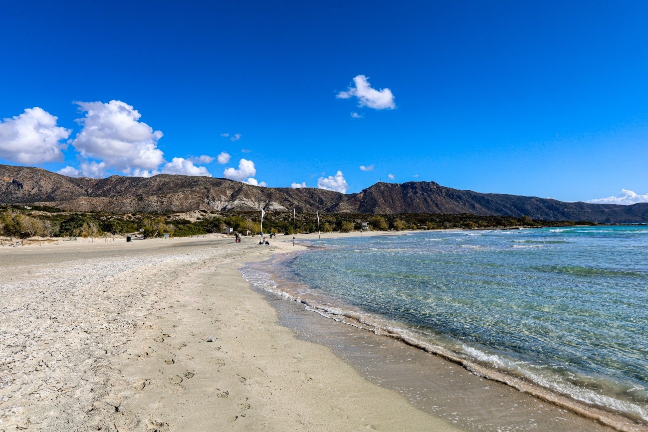 Finalmente chegamos ao objetivo da manhã, a Praia de Elafonisi, uma das mais famosas e impressionantes da ilha, pela sua beleza única e águas rasas cor de turquesa. A sua areia é branca e rosa, sendo que o rosado provém de fragmentos de conchas e corais. Neste período do ano, estava praticamente deserta, e o ambiente estava muito tranquilo e agradável. O dia estava lindo, com uma temperatura de 24 graus e a água deveria estar bem agradável. Algumas famílias chegavam, carregadas de “petiscos” para passar o dia de Natal, num local bem aprazível.