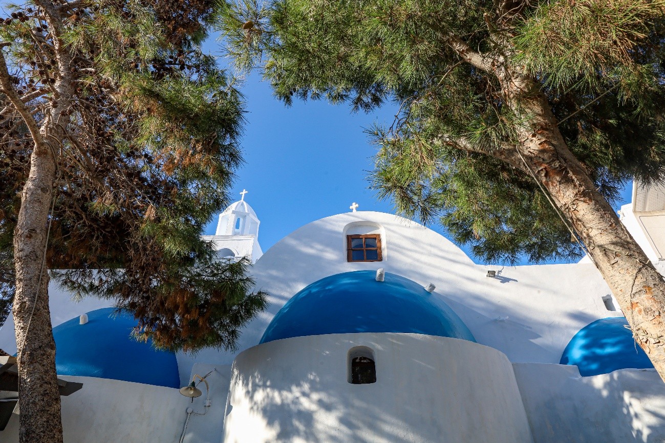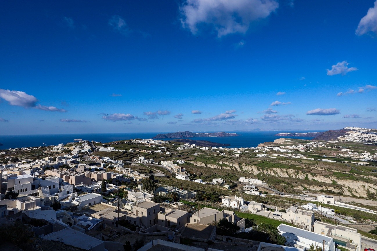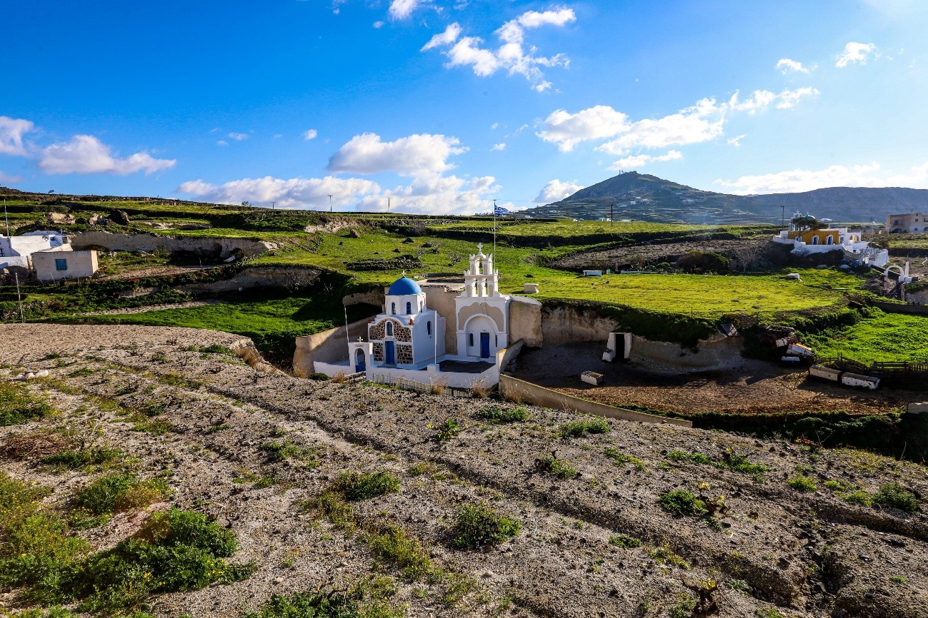 Tentámos visitar, no ponto mais alto da ilha, a 567 metros de altitude, o Mosteiro de Prophet Elias. Infelizmente, as visitas são às 05H30. Começamos o dia cedo, mas não tão cedo! Mas as vistas são fabulosas, com uma visão quase a 360º da ilha: a caldeira, as vilas e aldeias onde o branco predomina, as vinhas geometricamente plantadas. Sim, sim, vinhas! Apesar da aridez do solo, é essa pobreza que dá um carácter muito particular às uvas. A vinha aprende a sobreviver com pouca água e com vento constante. Diferentes das nossas vinhas, aqui as videiras são podadas de modo que fiquem enroladas em forma de ninho, junto ao chão. Esta técnica, já muito antiga, protege as uvas do vento forte e do sol intenso, além de aproveitar assim toda a humidade noturna, que se deposita no solo.