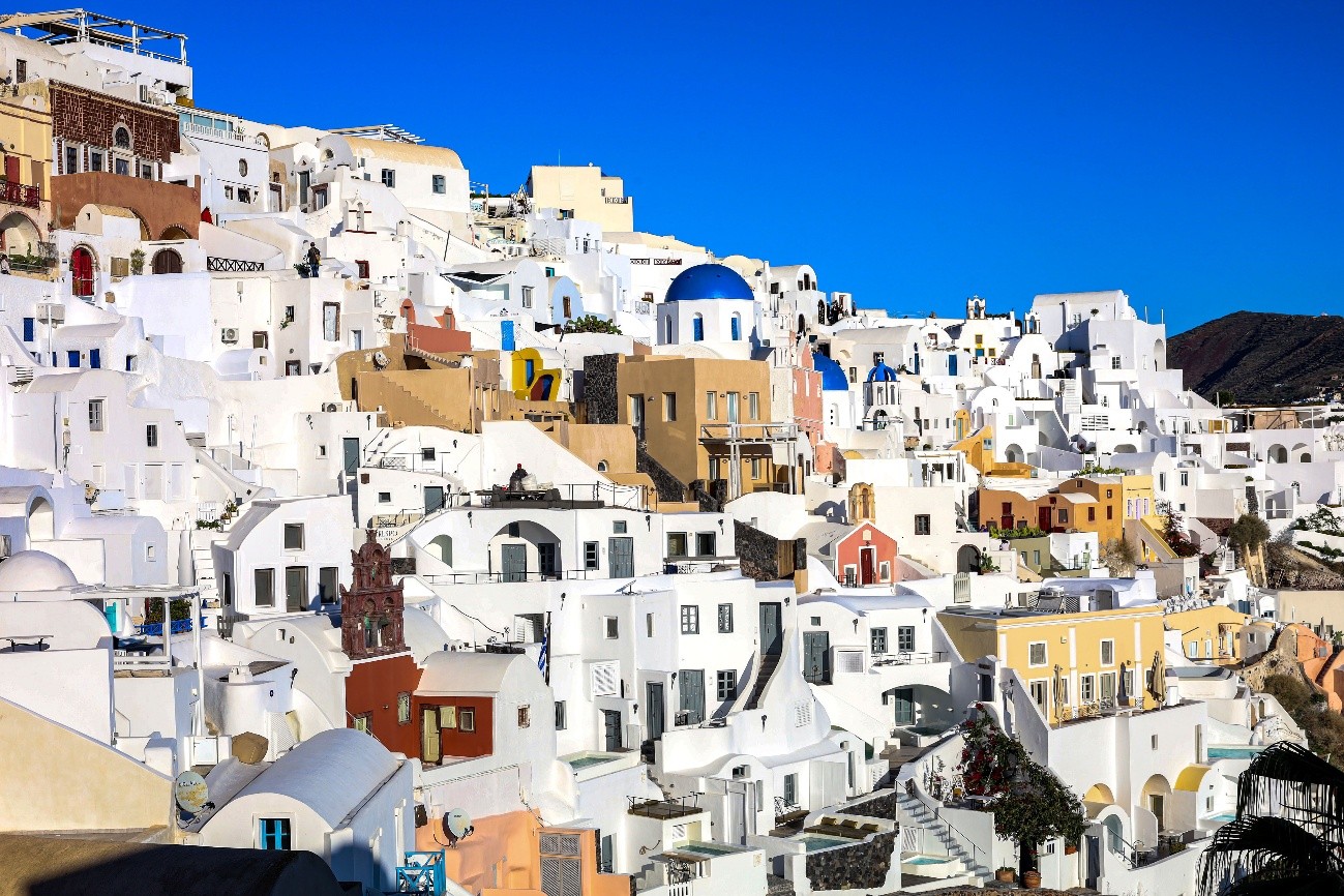 Oia tem uma arquitetura característica, de casas-caverna, escavadas na rocha da caldeira do vulcão, sobre o qual já falaremos mais adiante. As fachadas das habitações, são maioritariamente brancas, para refletir o mais possível, os quentes raios do sol de verão. Portas e janelas azuis, que parecem repetir a beleza do mar, cúpulas redondas e escadarias que sobem e descem sem lógica aparente, compõem todo este cenário idílico, quase parecendo que as casas falam com a paisagem, e que nos dão uma sensação de suspensão, parecendo estarmos sempre à beira do abismo. De antigas e humildes casas de pescadores pobres, passaram a turismo de luxo, com deliciosos e apetecíveis jacuzzis na varanda, com vistas incríveis.