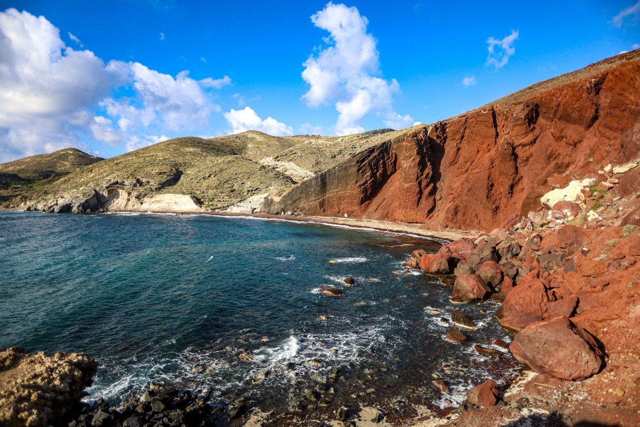 Fomos visitar a Red Beach, que fica perto de Akrotiri. O seu nome tem origem no vermelho ferrugem das escarpas que a ladeiam. Todo o conjunto desta praia, tem algo de uma bela pintura, com o vermelho, o negro da pedra vulcânica e o lindo azul do mar Egeu. Aqui percebe-se perfeitamente a brutalidade do nascimento desta ilha, de todo o fogo que a envolveu, parecendo ainda que a erupção foi ontem, num cenário algo marciano.